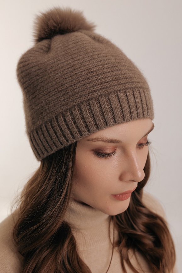 Шапка коричневая из 100% кашемира с пумпоном