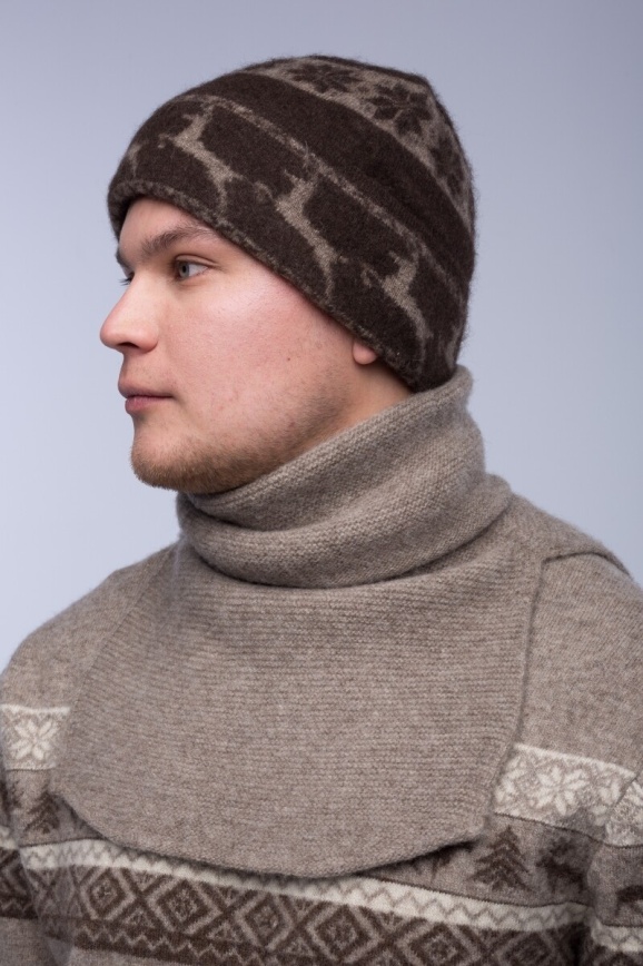 Шапка коричневая с оленями из 100% шерсти яка