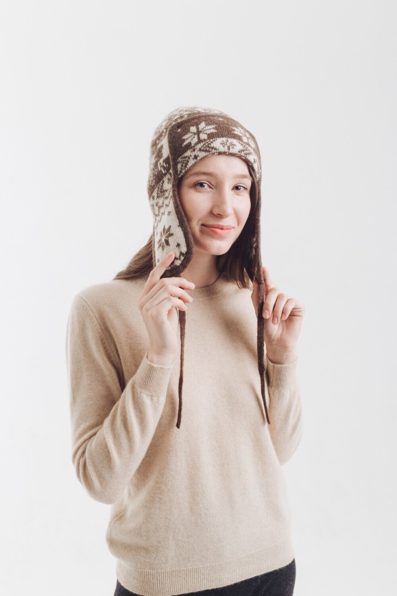 Шапка-ушанка белая с узором из 100% шерсти яка