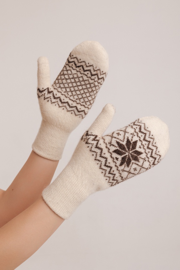 Варежки белые с орнаментом из 100% шерсти яка